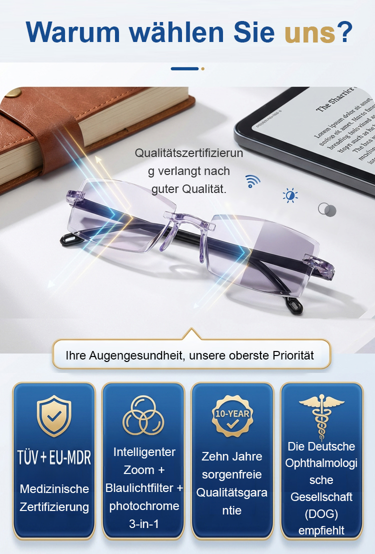 ✅Von der Deutschen Ophthalmologischen Gesellschaft zertifizierte Zoom-Technologie✅Innenraum Blaulichtschutz, draußen sofort Sonnenbrille✅6 Gramm ultraleicht, kaum spürbar✅Modisch und jung aussehend⏰ Lebenslange Garantie + 14 Tage kostenlos testen + Lebenslange kostenlose Sehberatung